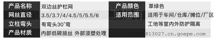 材料:低碳钢丝 规格:1.8*3 m 孔径:90*170 mm 编织工艺:焊接 目数:浸塑后4.5mm 丝径:3 mm 用途:铁路公路护栏网、市政隔离栅 品牌:龙盾 型号:加工定制 表面处理:浸塑 温馨提示